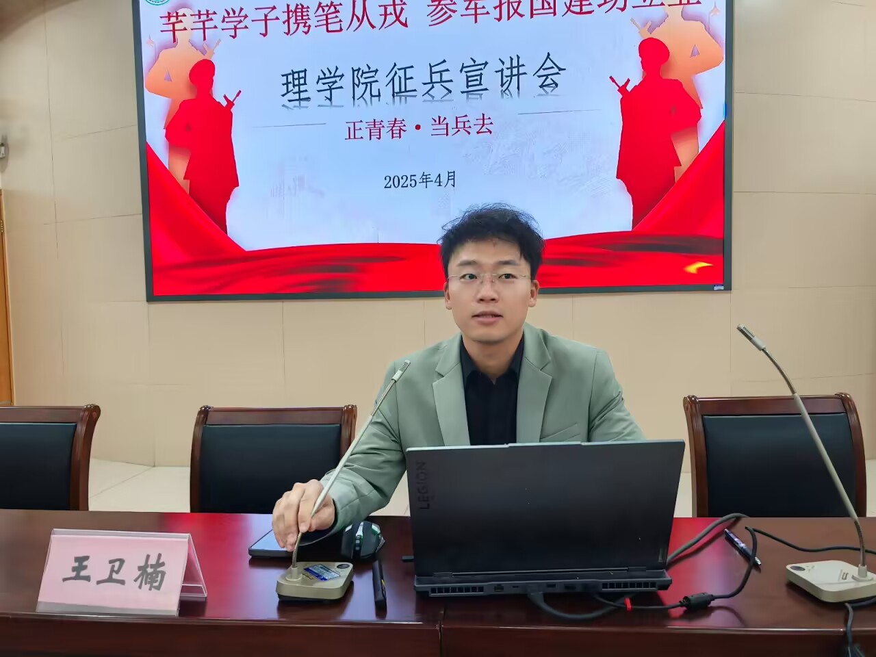 会上,王卫楠为大家详细解读了大学生征兵入伍工作的政策和流程,介绍了征集对象、基本要求以及相关经济优待政策,并结合往届应征入伍毕业生的经历体会生动展现了军营生活对个人意志的磨炼、能力的提升以及职业发展的深远影响。他强调,参军入伍不仅是高校毕业生的责任和使命,也是当代青年将个人理想融入国家发展大局的重要途径。他鼓励毕业生们勇敢走出舒适区,在军营里锤炼意识、增长才干,用青春热血书写报国篇章,为国防事业添砖加瓦。
