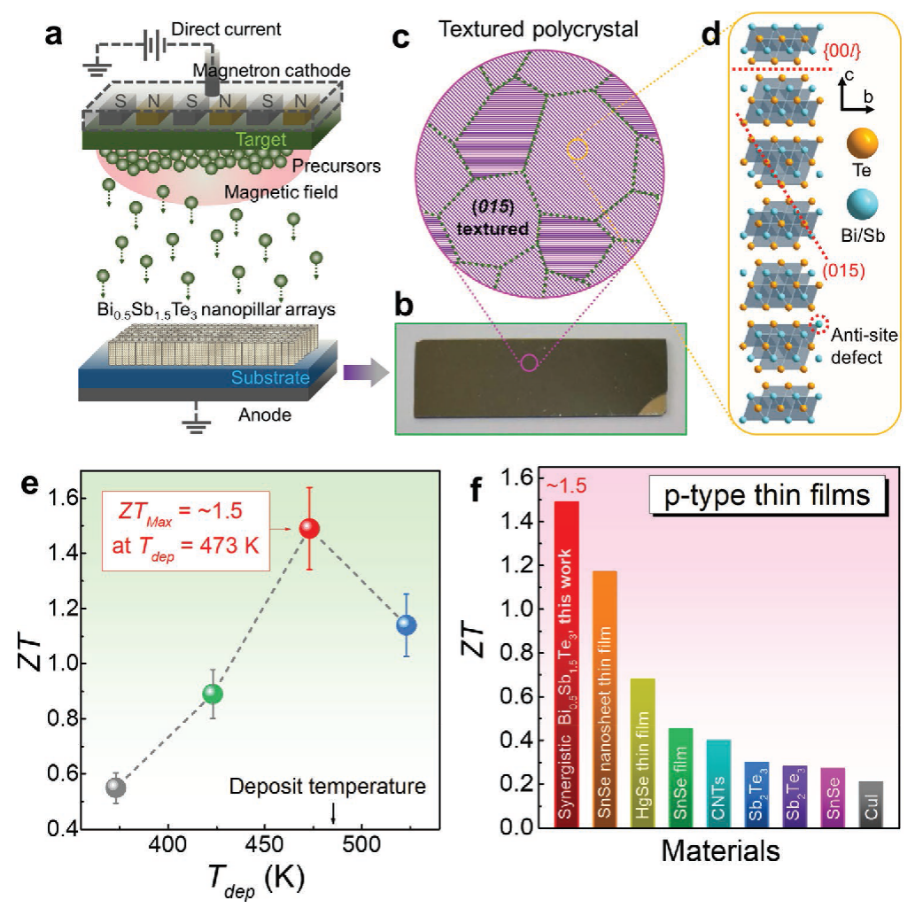 本研究表明晶体结构-Bi/Sb-Te反位掺杂协同调控是优化能带结构和提高Bi0.5Sb1.5Te3基材料zT值的有效手段,为制备高性能薄膜电源、制冷器和传感器奠定了基础。这种半导体薄膜在微型隐身飞行器、士兵微气候控制系统,健康状态监控的感应器,芯片热管理,可穿戴电子器件充电以及废热利用发电等方面有巨大的应用市场。
