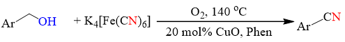 结合上述实验探究,作者提出了可能的反应机理:醇I首先在1,10-菲咯啉/Cu2O的催化下氧化脱氢得到醛II,然后通过单电子转移从Cu催化氧化形成酰基III(已通过自由基捕捉剂实验证明)。酰基自由基 III 与 FeII(CN-)6 反应生成 FeII 键合的以碳为中心的自由基 IV。然后IV和氧分子之间的反应得到苯甲酰异氰酸酯VI。最后,从苯甲酰异氰酸酯 VI 中消除二氧化碳分子,得到苯甲腈产物。