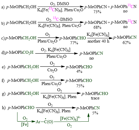 如图3为了探究反应中产生区域选择性的原因,作者进行了系列控制实验。当使用K4[Fe(13CN)6] (3a)或 13C-DMSO (3b)时,没有形成 13C 标记的产物,这表明 K4[Fe(CN)6] 和 DMSO 都没有提供碳给腈产物,因此在我们的条件下,氰基的碳原子来自醇是合理的。4-甲氧基苄醇在不存在K4[Fe(CN)6] 的情况下进行氧化脱氢得到醛,收率77%,醛与K4[Fe(CN)6] 在我们的条件下得到产物。这些结果表明本转化是逐步反应,其中醇氧化脱氢为醛,然后醛转化为腈(3c)。观察到少量4-甲氧基苯甲酸副产物,因此本反应可能经历了4-甲氧基苯乙酸的形成、脱羧和氰化,但基于以下结果排除了这种可能性: 目前的条件不允许 4-甲氧基苯乙酸转化为腈产物(3d)。有趣的是,当 Cu2O 不存在时,会形成 5% 的 4-甲氧基苯甲腈产物(3h),这表明 4-甲氧基苯甲醛可以直接与K4[Fe(CN)6] 反应。