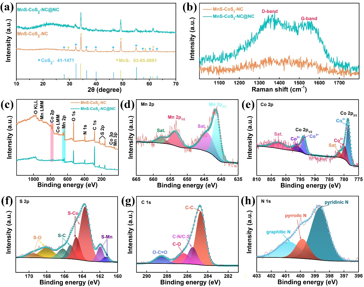 Figure 2. a) XRD analysis. b) Raman and c) XPS spectra of the MnS-CoS2-NC and the MnS-CoS2-NC@NC. d) high resolution Mn 2p, e) Co 2p, f) S 2p, g) C 1s and h) N 1s XPS spectra of the MnS-CoS2-NC@NC.