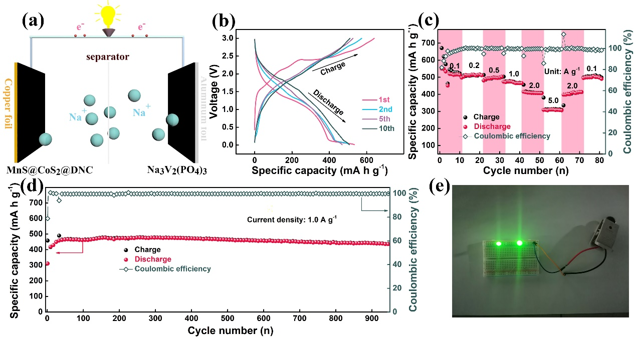 Figure 3. (a) Schematic illustration of MnS-CoS2-NC@NC-Na3V2(PO4)3 full-cells. The electrochemical performance of MnS-CoS2-NC@NC-Na3V2(PO4)3 full-cells. b) discharge–charge profiles at a current density of 0.1 A g-1. c) rate performance at different current densities. d) long cycle performance at 1.0 A g-1. e) Photo of MnS-CoS2-NC@NC- Na3V2(PO4)3 full-cells lighting up 2 LED bulbs.