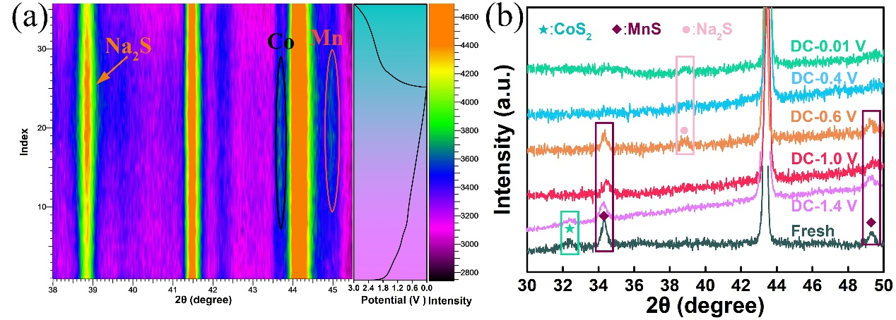 董玉涛等研究人员通过以Mn3[Co(CN6)]2‧9H2O作为前驱体,通过盐酸多巴胺进行包覆后,与硫粉煅烧,最终得到了具有两种氮掺杂碳结构的空心双金属硫化物(MnS-CoS2-NC@NC)。两种氮掺杂碳的纳米结构特征,不仅可以提高电极材料的整体电导率,明显有利于钠离子的快速传输,从而获得优异的倍率性能,而且还可以缓解体积膨胀,保持电池的循环稳定性。在钠离子半电池中,MnS-CoS2-NC@NC电极不仅在0.2 A g-1下提供608.5 mA h g-1的超高比容量,而且在5.0 A g-1下循环1100圈后仍然能表现出560.5 mA h g-1的倍率性能。即使在以Na3V2(PO4)3为正极材料组成的全电池中,在1.0 A g-1下循环900圈后,仍能保持436.7 mA h g-1的比容量。针对其展示出的优异的电化学性能,该课题组通过in-situ XRD和ex-situ XRD测试手段对其反应机理进行了深入的探究,揭示了MnS-CoS2-NC@NC电极在储钠过程中发生的转化反应机理。