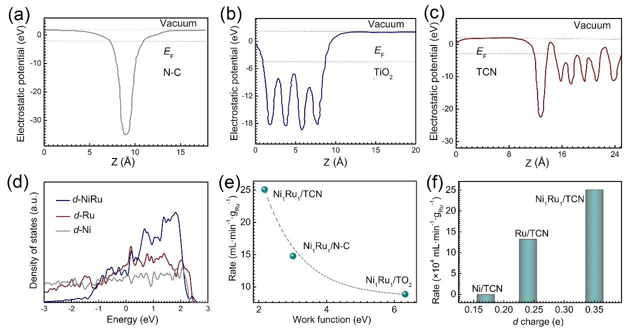 为了从本质上阐明NC、TiO2和TCN三种载体在NH3BH3水解制氢催化反应中的差异,进行了DFT计算。图1为N-C、TiO2和TCN界面结构的静电势。N-C、TiO2和TCN的功函数分别为3.01、6.32和2.17 eV(图1a-c)。图1d为d轨道在金属表面的DOS。通过计算d轨道,Ru/TCN、Ni/TCN和Ni1Ru1/TCN的表面d电荷分别为0.35、0.24和0.17 e。图1e显示了催化剂活性与载体功函数的关系。显然,当N-C与TiO2复合后形成N掺杂碳包覆TiO2 (TCN),很好地优化了载体的功函数,从而有效地提高了负载NiRu合金的催化性能。由于TCN载体的独特功函数,它更适合负载NiRu合金NPs。结合XPS表征结果可以明显看出,TCN能有效促进d电荷在负载金属表面的转移,增加催化活性位点。图1f显示了NH3BH3水解的催化活性与金属表面d电荷的关系。NiRu合金的d电荷与Ru或Ni单一金属不同。合金间的电荷转移有利于催化活性的提高。