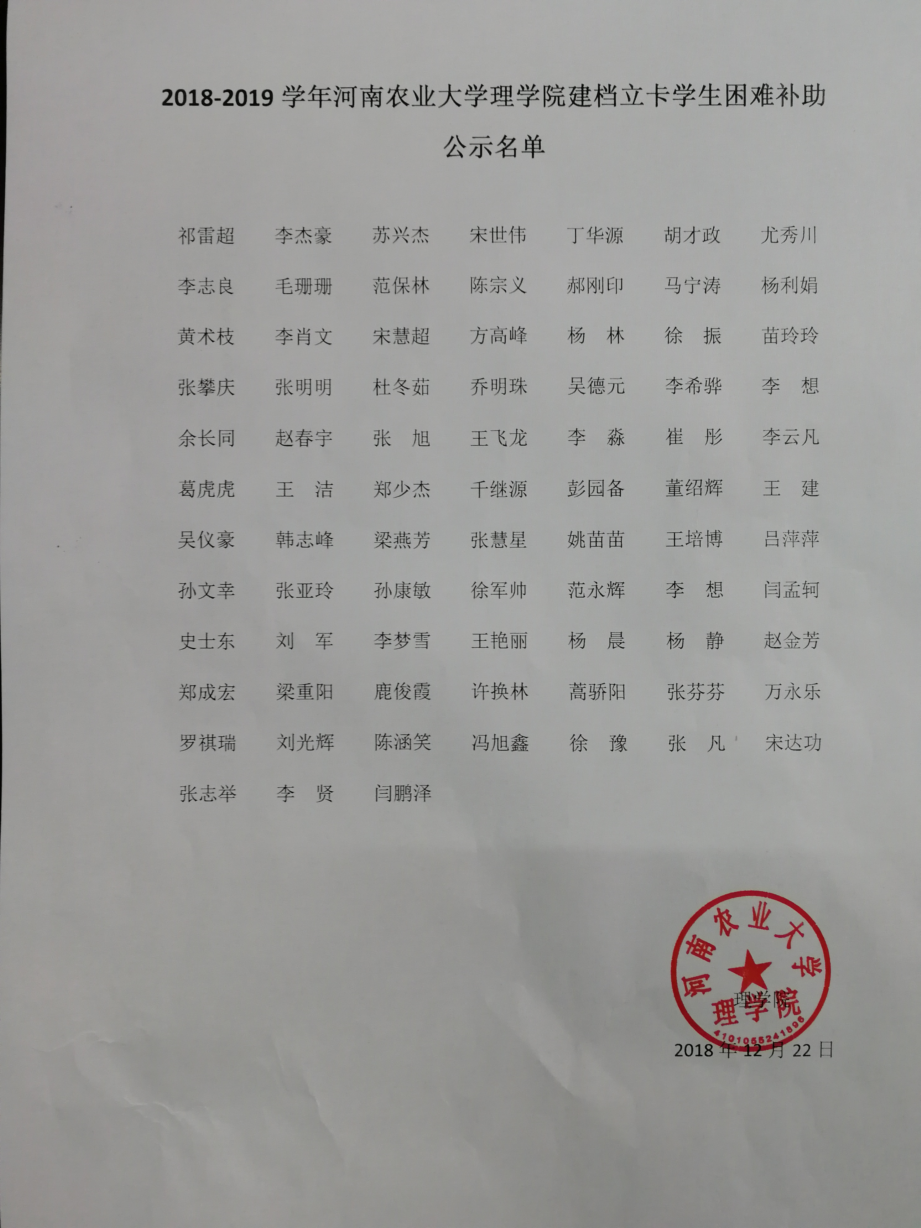 2018-2019学年太阳城官网 建档立卡学生困难补助公示名单