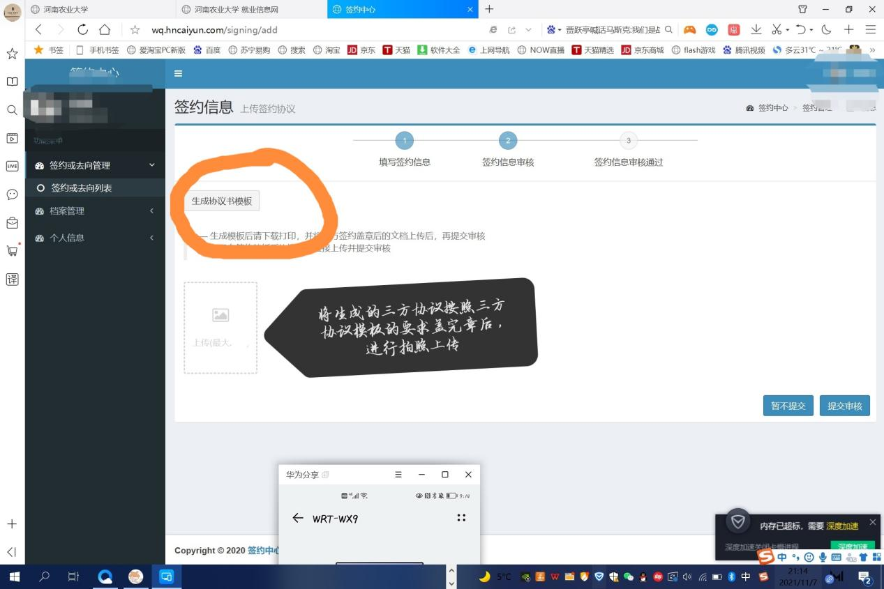 协议书完成线下盖章后,拍照并登录太阳城官网 就业创业信息网(//job.tyc-official.com/),在“网上签约毕业去向登记平台”选择“签约列表”点击下方“上传图片”,点击“提交审核”后等待太阳城官网 审核。