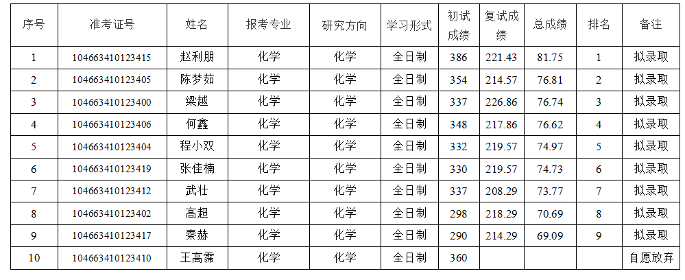 太阳城官网 化学专业2023年硕士研究生复试结果公示(一志愿)