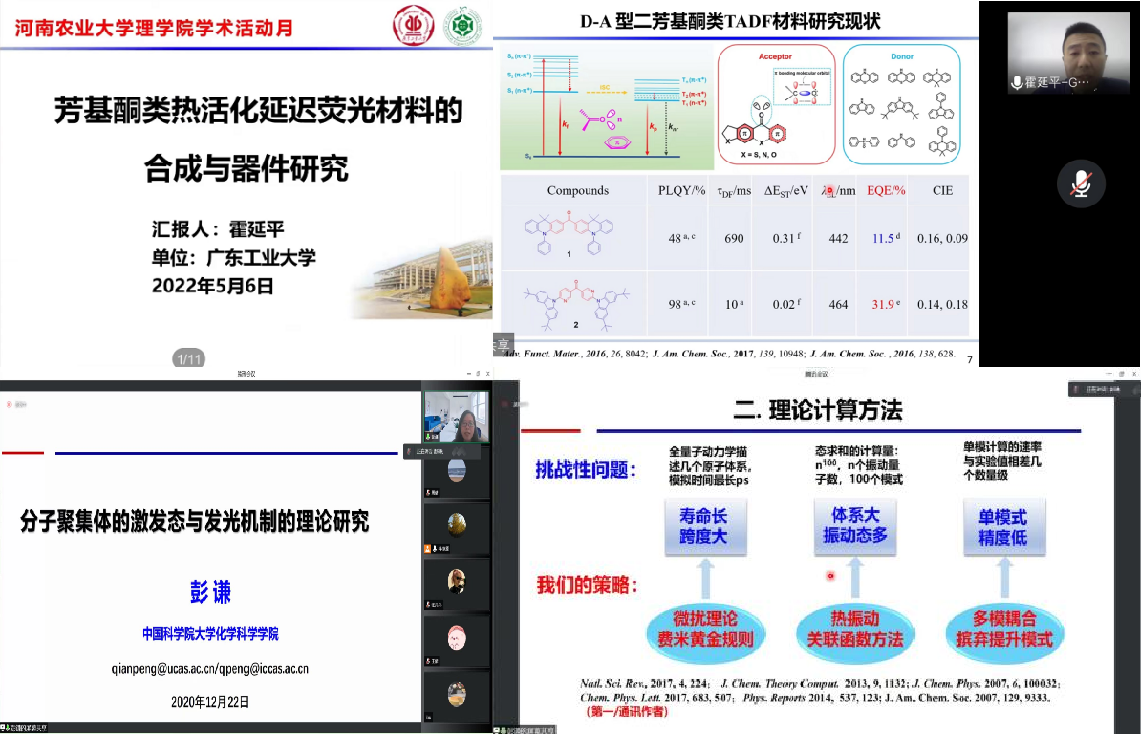 中国科太阳城官网 大学彭谦教授带来了题为《分子聚集体激发态与发光机制的理论研究》的报告,他介绍一种普适的有机分子激发态过程的速率理论及计算方法,并应用该方法阐明新型有机聚集体的发光机制,例如聚集诱导荧光、聚集诱导热激活延迟荧光、纯有机室温磷光等。同时,基于发光机制,建立有机材料分子结构-性能关系,提出高发光效率的有机发光材料分子的设计策略。