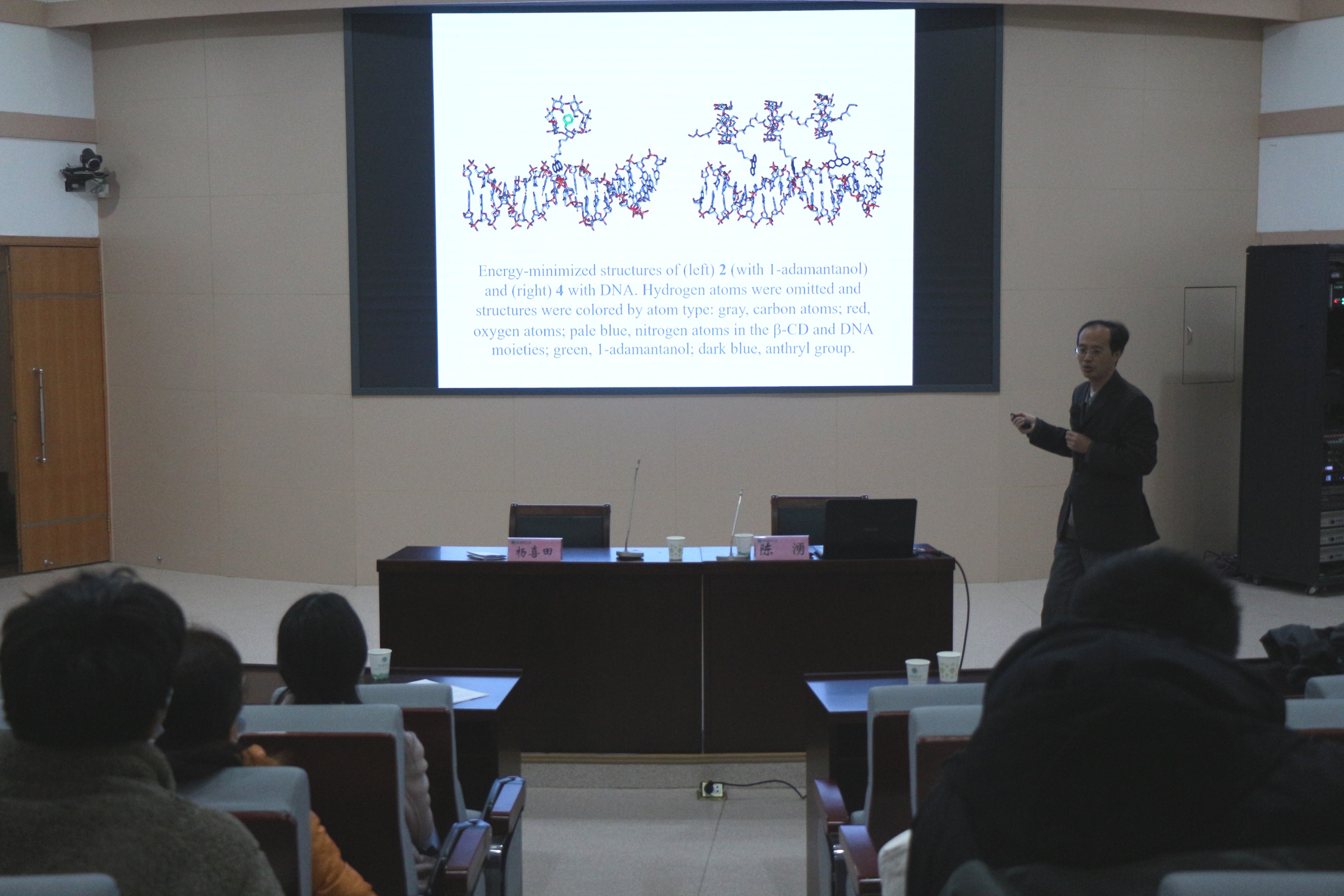 陈湧教授以“大环主体与生物大分子组装体的构筑与功能”为题为太阳城官网 师生作报告。他基于环糊精的分子识别,对单修饰环糊精的分子识别、桥联双环糊精的分子多重识别、杯芳桥联环糊精的协同多点识别进行了详细讲解,并系统介绍了基于环糊精的分子组装问题。