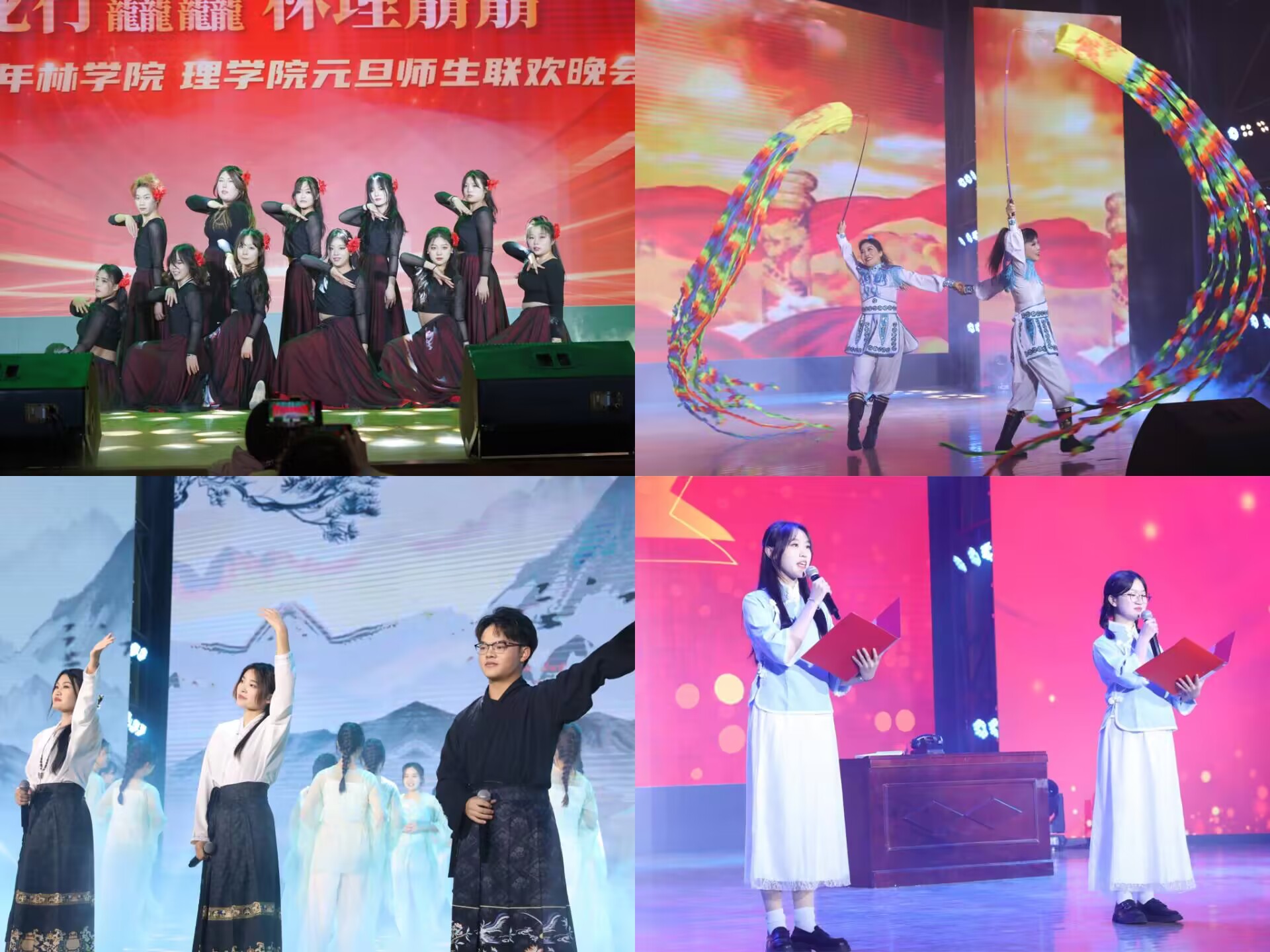 晚会分为“龘龘耀新年”“朤朤迎未来”两个篇章。开场舞《奔跑吧青春》用热烈旋律拉开活动序幕,瞬间点燃现场观众的热情。街舞《冬日女孩》以其独特的魅力,展现出了当代大学生青春的活力与朝气;歌伴舞《兰亭序》将古典文化与现代表演完美结合,带领观众穿越时空,感受历史的厚重;舞台剧《共和国之恋》以深情演绎红色经典,带领观众回顾那段激情燃烧的岁月;杂技《龙鼓竹韵》以其精湛的技艺,赢得了观众的惊叹与掌声,将全场气氛推向高潮;舞蹈《莲韵》以其柔美的姿态,展现了东方女性的优雅与婉约;小品《反诈银行》以其幽默的情节,让观众在欢笑中收获智慧;歌曲联唱《林听·理音》为观众带来一场音乐的狂欢;舞蹈《旖旎》以其柔美的舞姿,展现了未来的美好憧憬;小品《天网恢恢》以其深刻的寓意,引发师生的反思与警醒;乐器民谣《河流》为我们带来一场听觉盛宴;街舞《开心跳龙门》以其欢快的节奏,带领学生跟随音乐一起舞动;歌曲《如愿》用其深情的演唱,唤起大家内心的共鸣;歌伴舞《一起向未来》为晚会画上圆满的句号,寓意着新的一年,我们携手共进,共创未来。现场气氛热烈非凡,观众纷纷挥动手中的荧光棒为表演者加油鼓劲。