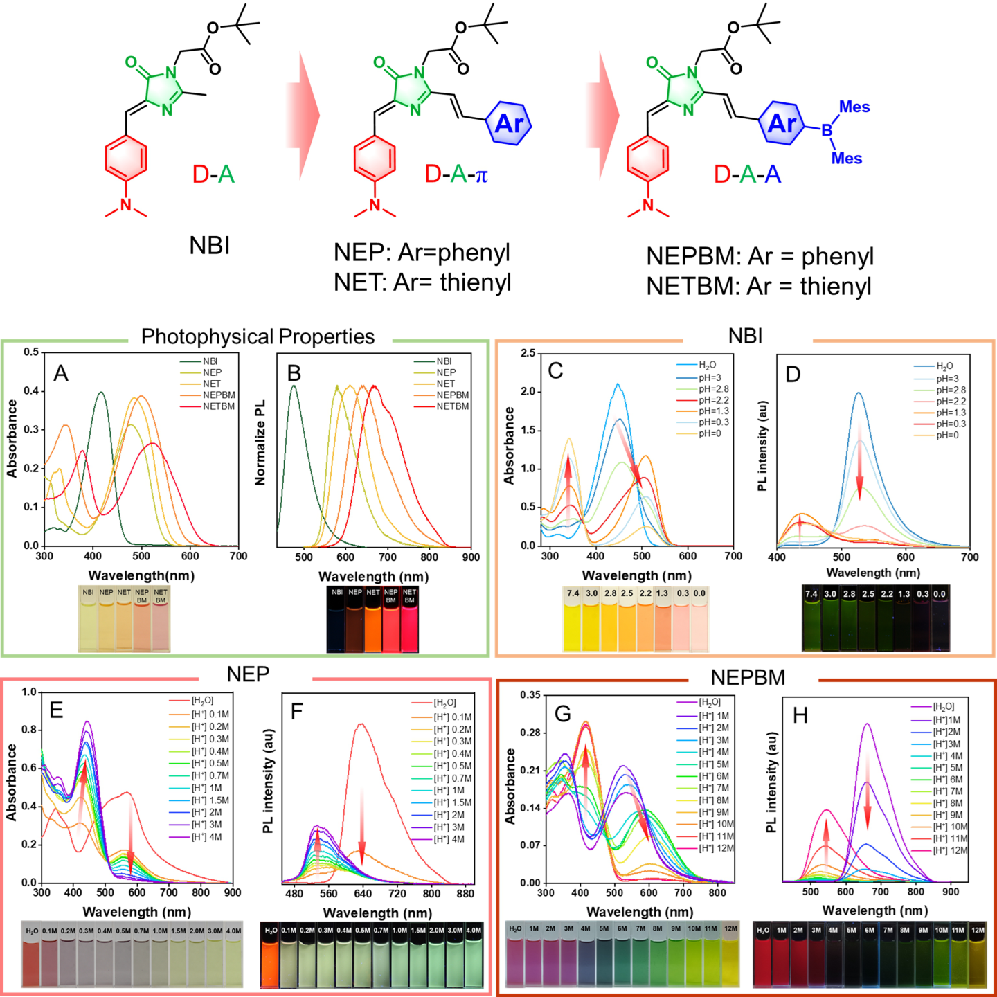 基于以上问题,作者基于构筑了一系列基于NBI型AIEgens,阐明了D-A、D-A-π和D-A-A分子结构对NBI衍生物光物理性质的调控作用,实现了对其吸收和发射光谱的广色域调控。由于其双质子化位点的结构特点,不同酸度下呈现出独特的多色、多步酸致变色行为,可实现超宽范围的多级酸度检测。通过光物理测试结合理论计算,作者揭示了该系列分子内N原子的质子化顺序和酸致变色之间的关系。