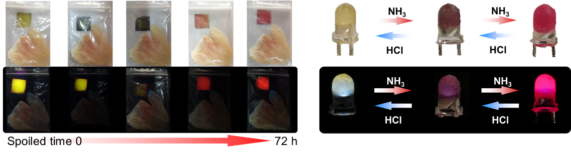 食品变质过程中产生大量的生物胺,因此及时定量其浓度是一项挑战。为了解决这个问题,酸化的AIEgens芯片可实现双通道(可见光和荧光)实时监测鱼类腐败的过程。腐败时间的延长,荧光从黄色转变为鲜艳的红色,具有良好的预警作用。同时,也开发出实时监测环境中酸性蒸汽和NH3或有机胺水平的LED器件。这些器件表现出对酸碱气体浓度的强烈依赖,展示了一种动态的多色酸碱变色,适用于农业、食品安全评估和相关领域的应用。
