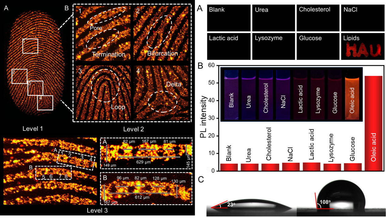 图4、有机硼AIEgens对潜指纹1 – 3级结构的原位高分辨荧光成像(左);有机硼AIEgens对汗液和皮脂中油脂的识别效果,及其薄膜疏水性的测试(右)。