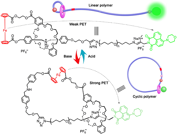 拓扑结构变化广泛存在于自然界中,例如DNA 具有双螺旋结构,当生命活动涉及到DNA 的转录、翻译以及折叠等过程,就会伴随着拓扑结构的转变。由于环型拓扑结构的聚合物没有末端,与线型或支化拓扑结构的聚合物相比,在结构以及理化性质等方面大相径庭,在微电子、生物医药、环境处理以及高性能材料方面取得了极具特色的应用。但是由于合成以及纯化困难,使得创造新的环型聚合物仍是一项不小的挑战并限制了其大范围的应用。作者采用一种只需简单酸碱刺激就可驱动聚合物微观拓扑结构发生宏观肉眼可视变化的策略来制备环型聚合物。作者在[1]轮烷分子梭的杆状骨架上引入柔性聚四氢呋喃链,设计并制备基于双稳态[1]轮烷分子梭的线型-环型拓扑结构可逆转变聚合物。聚合物的两端分别引入二茂铁功能化的[1]轮烷和绿色荧光的萘酰亚胺基团,分子内能够表现出距离诱导的光致电子转移作用(图5)。通过简单的酸碱刺激,双苯并24冠8大环在二苄铵和甲基三氮唑两个不同识别位点穿梭,发生肉眼可见的荧光强度变化(图6),证明聚合物发生线型和环型拓扑结构转变。这项工作为构建具有拓扑结构的环型聚合物提供了一种新的策略。(Chin. Chem. Lett., 2022. 33, 1533-1536)