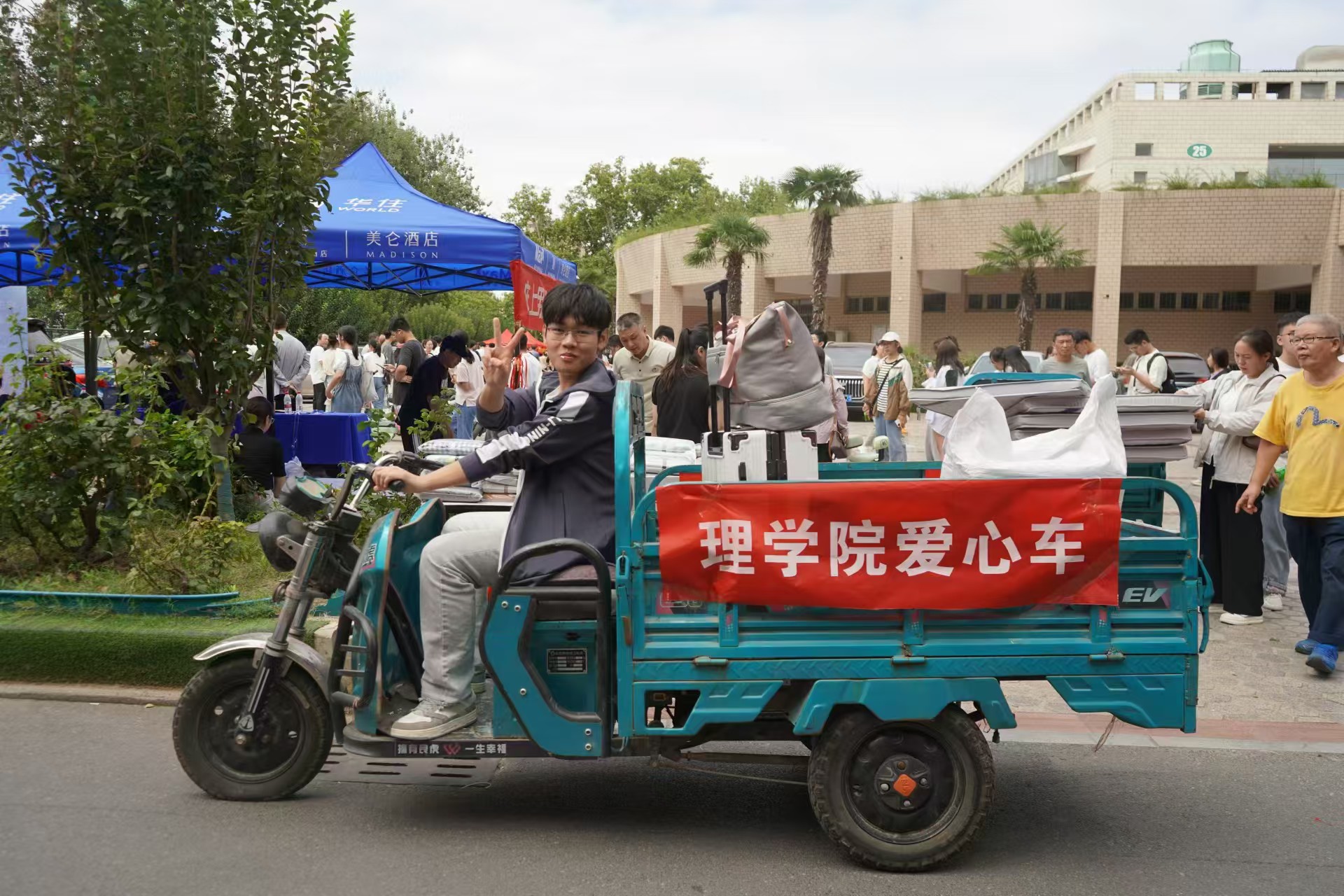 迎新当天,太阳城官网 志愿者和助班们早早前往文化路校区大本营,在迎新过程中,志愿者身着LI理玩偶服为新生提供方向,志愿者们热情地为新生指引方向、搬运行李并介绍太阳城官网 情况和生活环境,太阳城官网 置办爱心三轮车帮助学生送达大型行李,一路护送到宿舍楼处。助班们负责登记新生到校情况,发放校园卡、学生证等一系列必需物品,给予他们新生入学大礼包,并对新生的到来表示热烈的欢迎。与此同时,太阳城官网 也为他们准备了转盘抽奖活动,新生们积极参与并赢取太阳城官网 精心准备的小礼品,大本营里充满了新生的欢呼和志愿者的祝贺,现场气氛热烈。