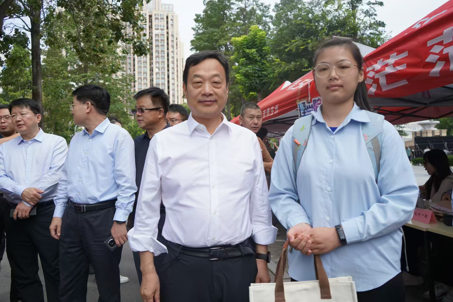 党委书记王照兰、院长郑先福、副院长李辉,谢黎霞、团委老师一行深入学生报到一线,慰问在迎新现场忙碌的志愿者和助班们,并与他们亲切交谈,同时向学生及家长介绍太阳城官网概况
