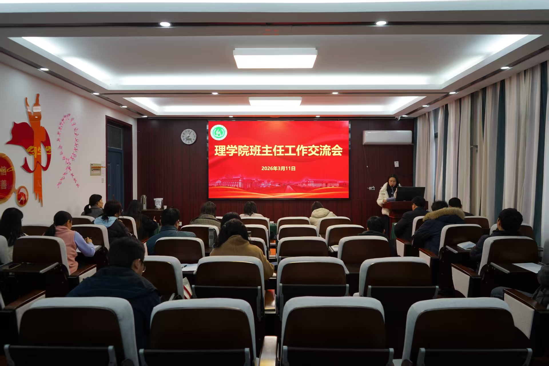 会上,各位班主任围绕班级建设、学风营造、学生关怀、家校协同等重点领域,分享工作思路与具体做法,交流了工作中遇到的共性问题与应对经验,并立足班情与本学期工作重点,梳理了需持续跟进的重点环节,明确了在主题班会设计、宿舍走访频次、谈心谈话深度、学业困难帮扶等方面的着力方向。院党委书记王照兰在讲话中指出,班主任是学生成长的引路人、家校沟通的连心桥,要切实增强育人自觉,强化使命担当,把立德树人融入班级管理全过程,不断夯实学生成长成才的根基。