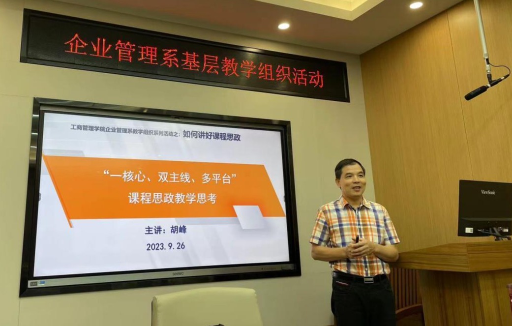 232教室举行主题为“如何讲好思政课”的基层教学组织活动。活动上,胡峰老师和梁世昌老师分别以《“一核心、双主线、多平台”课程思政设计》和《科研思维推动课程思政教学》为题,结合自己所授课程和科研经历,以《人力资源管理》《创业学》《微观经济学》为例,给大家进行现场示范教学,演示如何将思政元素有机融入专业课程的教学中。