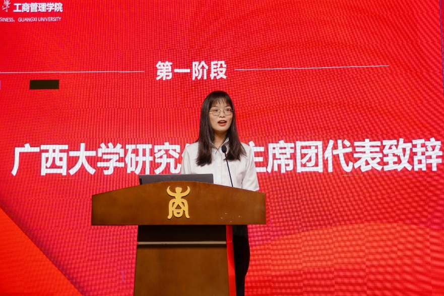 第二届研究生主席团党员代表翟艳洁宣读倡议书,向同学们发出倡议:强化思想建设,深化思想认识;扎根商科之学,投身一流建设;不忘初心使命,勇当时代新人。