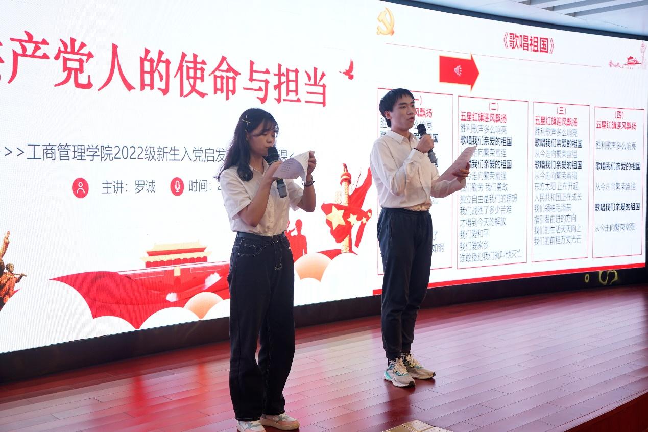 学生艺术团的杨玉玲和何昊骞两位同学领唱、全体师生合唱《没有共产党就没有新中国》、《歌唱祖国》两首歌,希望同学们明白没有共产党就没有新中国,没有共产党就没有中华民族伟大复兴。在振奋激昂的歌声中,本次入党启发教育圆满结束。