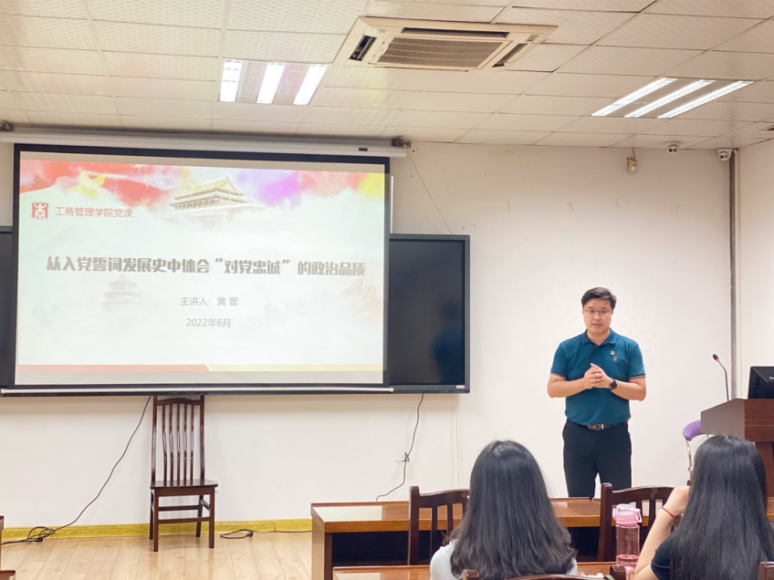 6月17日,院党委副书记、纪委书记黄晋在研究生第二党支部讲授专题党课。他以“从入党誓词发展史中体会‘对党忠诚’的政治品质”为主题,阐述了入党誓词共经历了5次主要变化的历史,强调“人的一生会做出许多承诺,但对于共产党员而言,最神圣最庄严的承诺就是在党旗下的宣誓。宣读誓词、牢记誓词、维护誓词、践行誓词是党对每一名党员的基本要求。”