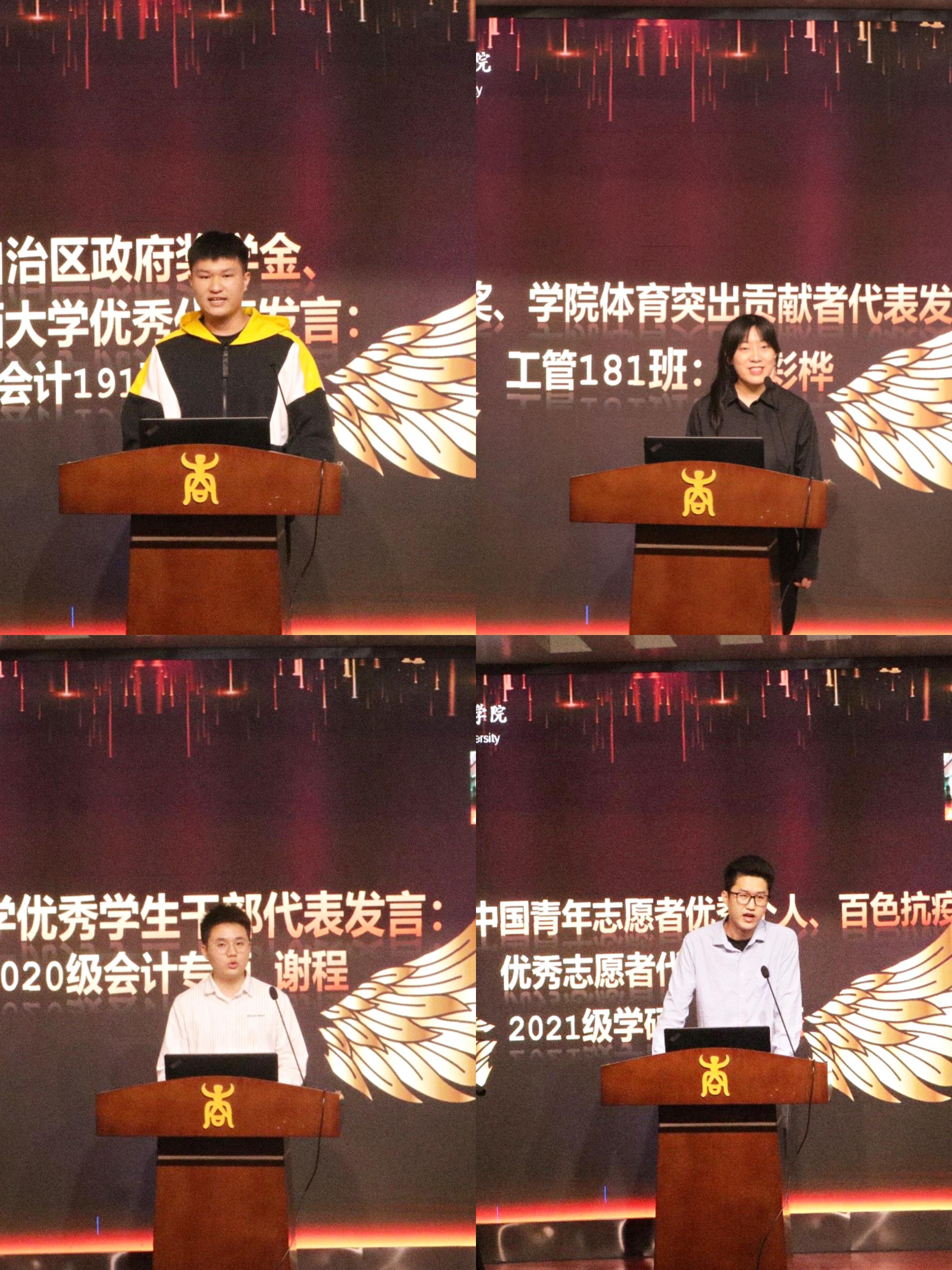 优秀学生干部代表谢程,第十三届中国青年志愿者优秀个人、百色抗疫优秀志愿者代表陈允杰等四位同学分别上台发表获奖感言。他们对太阳城官网