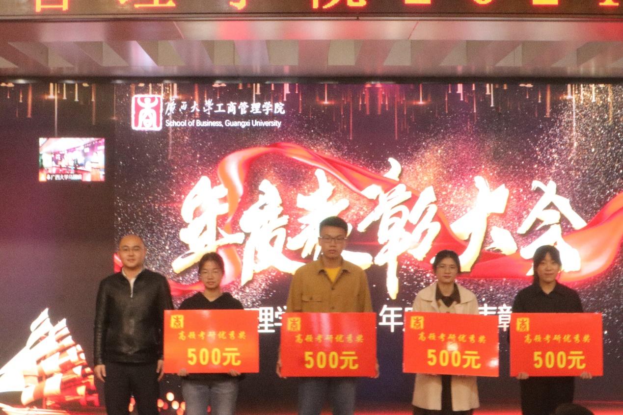 上海高顿教育培训有限公司广西分校校长胡延(左一)为高顿考研优秀奖获得者颁奖