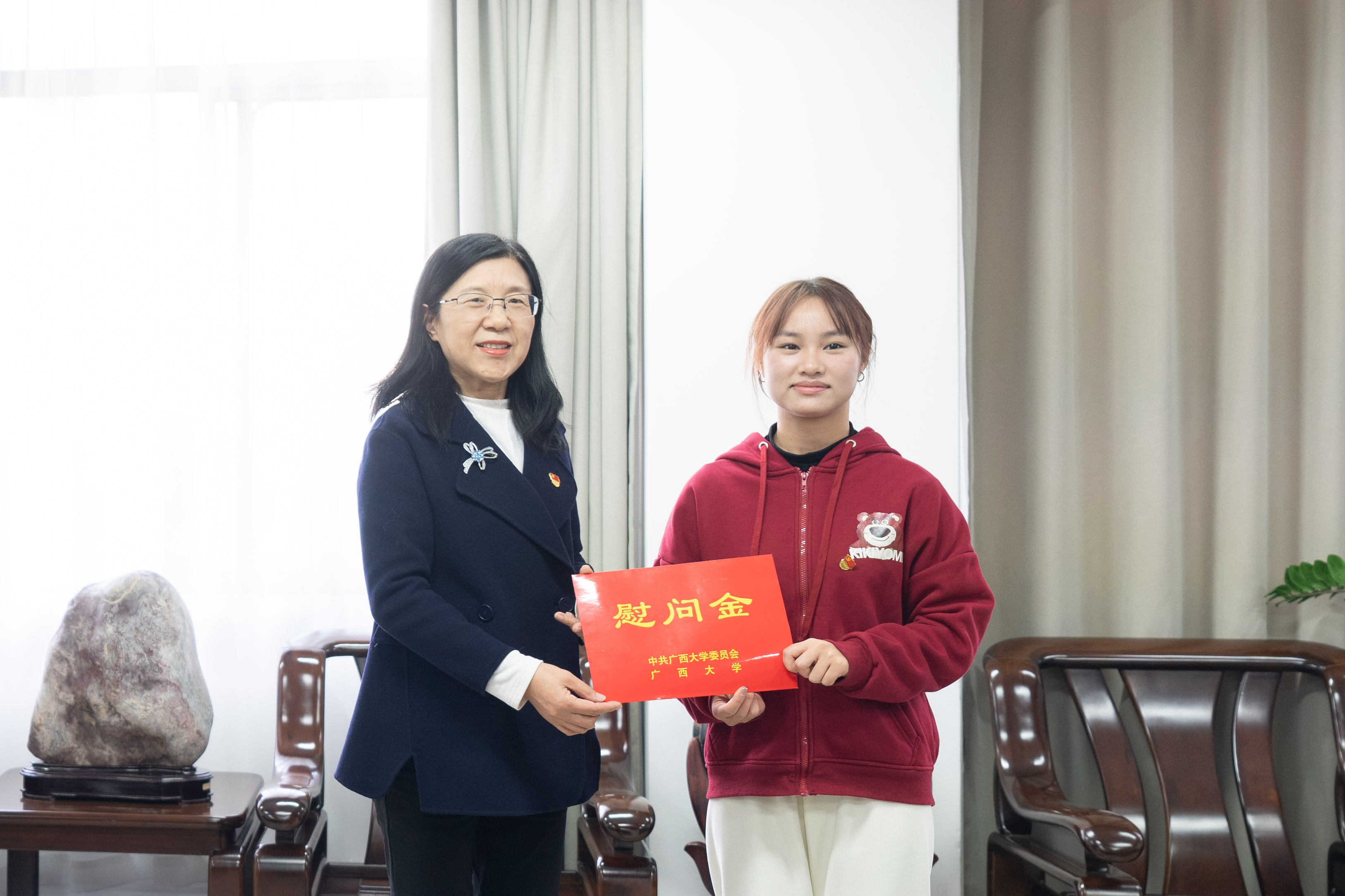 研究生党员代表韦尹洁,送上党组织的关怀和祝福。党办校办、组织部、学生工作部(处)负责人陪同慰问。太阳城官网