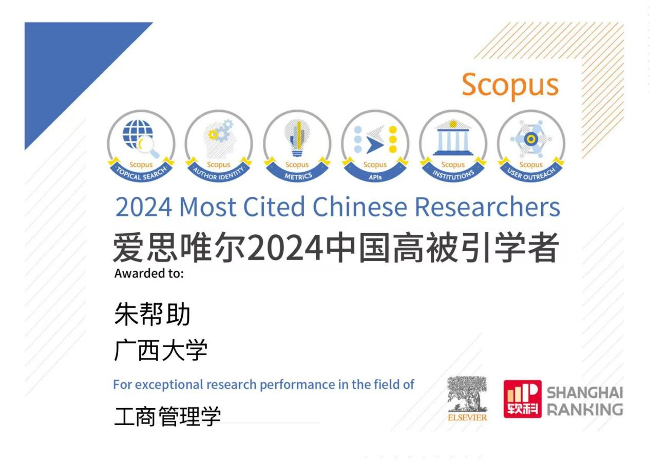 朱帮助教授再次入选,实现了2021-2024年连续四年登榜,彰显其在工商管理学领域的显著学术影响力。