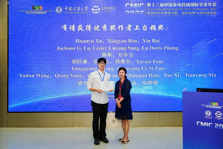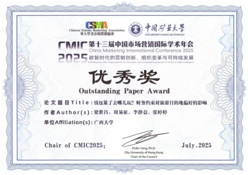 此次获奖论文聚焦财务约束对消费者旅游偏好的影响机制,通过实证研究揭示了消费者在主观感到财务约束时的旅游决策逻辑,拓展了营销研究在旅游消费行为领域的理论边界。该成果在年会平行论坛中进行了宣讲展示,受到与会专家的高度评价,充分体现了团队在时代背景下对消费心理与行为研究的深入思考与创新探索。