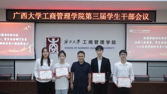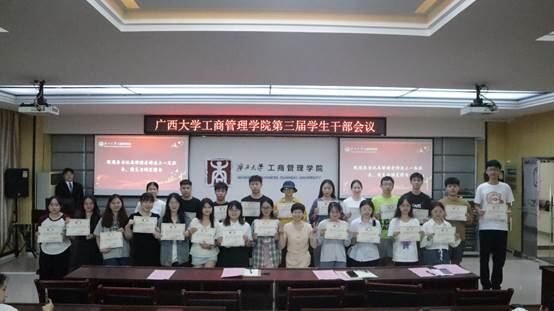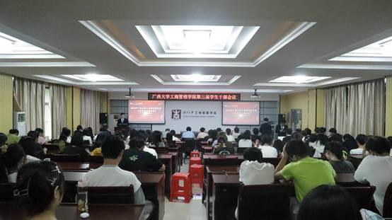 124教室,召开第三届全体学生干部会议。院党委副书记黄晋、院团委书记马丽娟、院团委副书记岑汉成、院学生辅导员莫秀德、郁文丹出席本次会议。