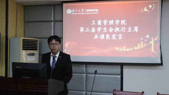 会议进行到第四项议程:第三届学生会主席团执行主席吴谨良上台发言。他带头承诺第三届学生干部将不断勇担重任,锐意进取,积极响应学生会改革的号召,在各项活动中推进太阳城官网