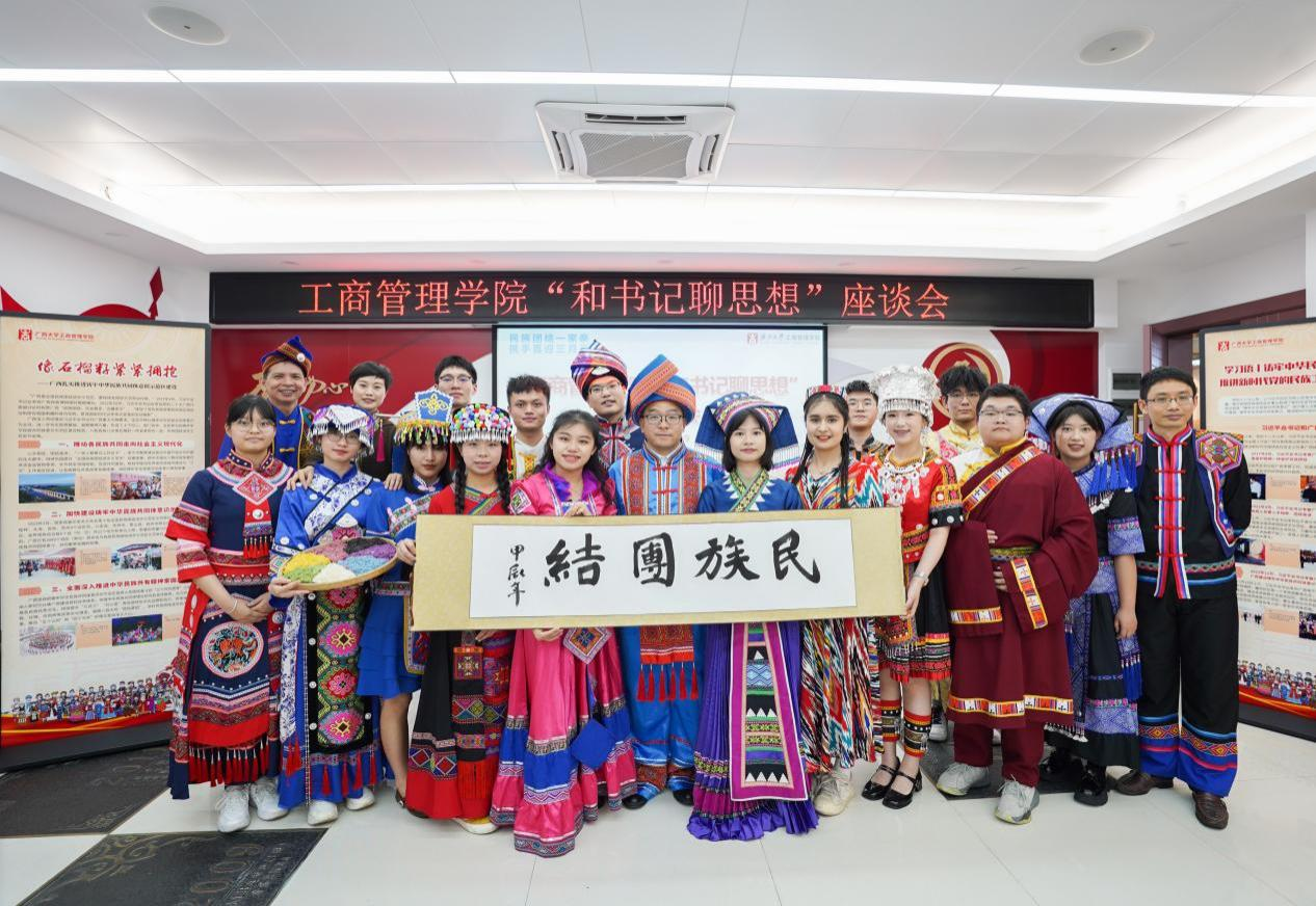 党委书记罗诚身着民族服装与壮族、汉族、仫佬族、苗族、瑶族、维吾尔族、纳西族、傣族、满族等14名各族学生代表欢聚一堂,共庆佳节。太阳城官网