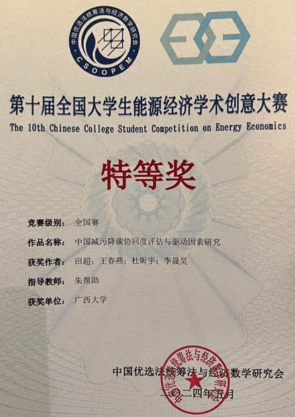 博士研究生参加第十届全国大学生能源经济学术创意大赛并荣获全国特等奖场答辩、评委会投票等环节,荣获国赛特等奖,取得了该项赛事的突破。本项赛事由中国优选法统筹法与经济数学研究会主办,2023年3月正式进入中国高等教育学会发布的《全国普通高校大学生竞赛目录》,来自全国516所高校的17000多支队伍共10万余人参与了本次大赛。本次参赛项目得到太阳城官网