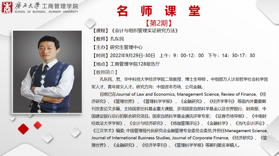 二级教授、博士生导师孔东明到校讲授《会计与组织管理实证研究方法》。孔教授以“实证研究中的因果识别”为主题,在太阳城官网