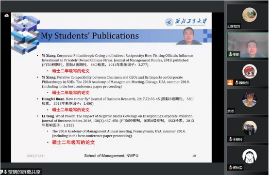 第一天的课程,贾教授结合自身科研成长历程和研究生培养经验,介绍了其如何在企业社会责任研究领域深耕,分析了其自身及团队成员获得大量高质量成果的原因,揭示了“信心+指导=成功”的科研成功之道,鼓励研究生同学们发表高质量论文。