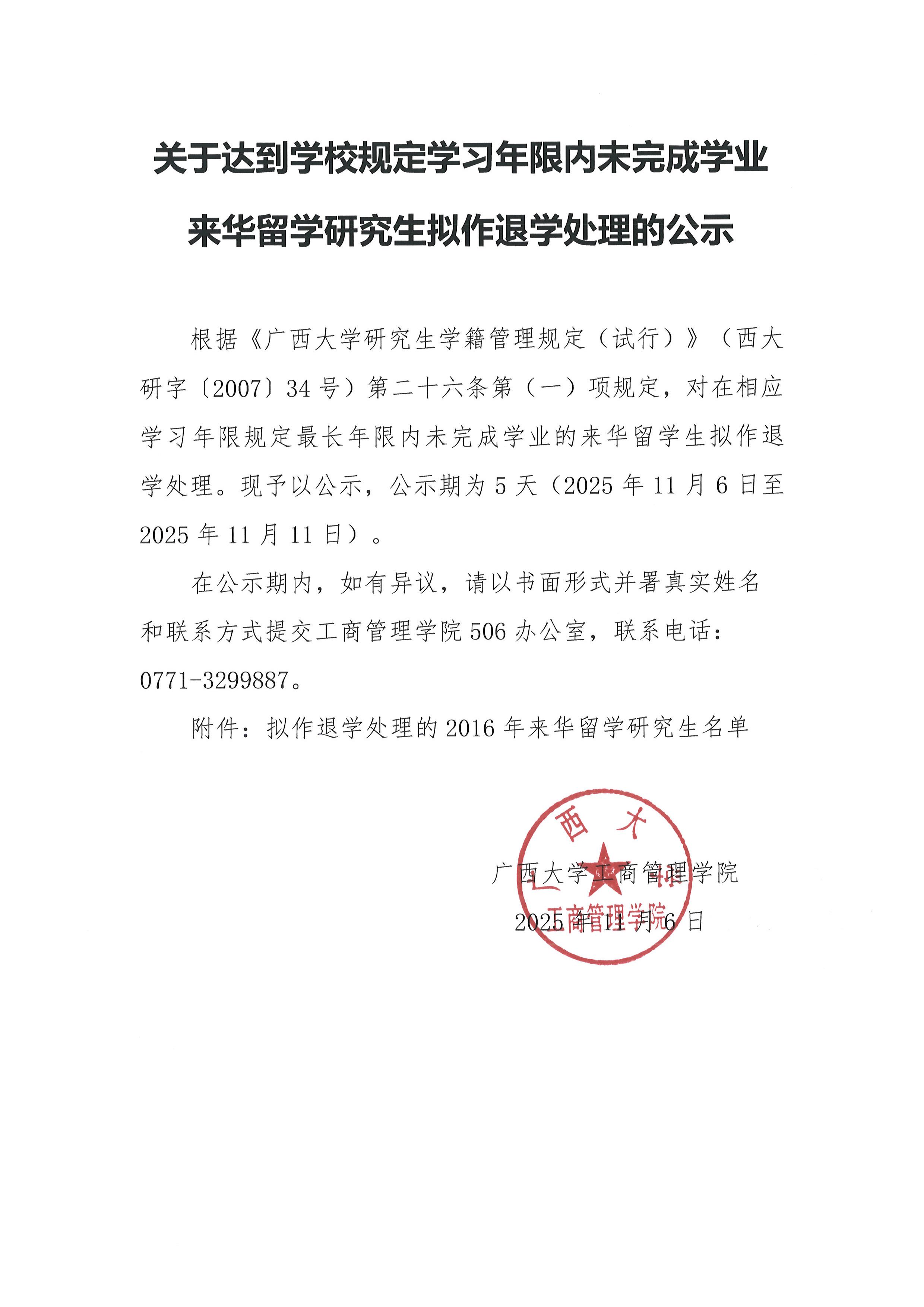 关于达到太阳城官网 规定学习年限内未完成学业来华留学研究生拟作退学处理的公示