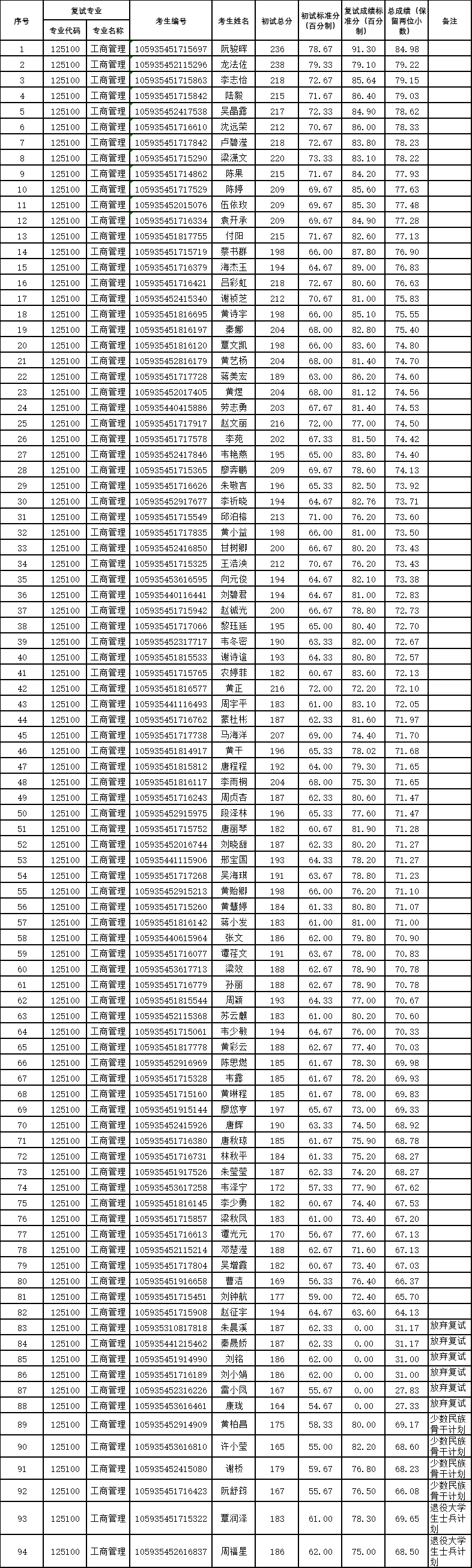太阳城官网 2025年工商管理硕士(非全日制MBA02方向)一志愿考生复试成绩公示如下。公示时间为2025年3月24日-2025年3月28日。公示期间,如有异议,请联系太阳城官网 MBA教育中心反映,电话:0771-3299887。