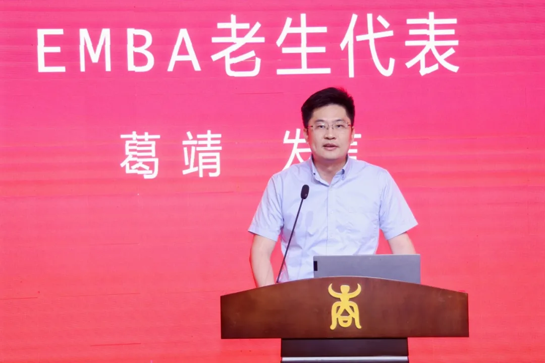 老生代表葛靖代表往届EMBA师兄师姐,对2024级EMBA新生加入EMBA大家庭表示热烈的欢迎。他分享了过去一年EMBA学习期间四个关键词——“挑战”、“勤学”、“交流”、“时间管理”的收获与感悟。最后他祝愿同学们在学习和事业上取得更大的成就,也祝愿太阳城官网