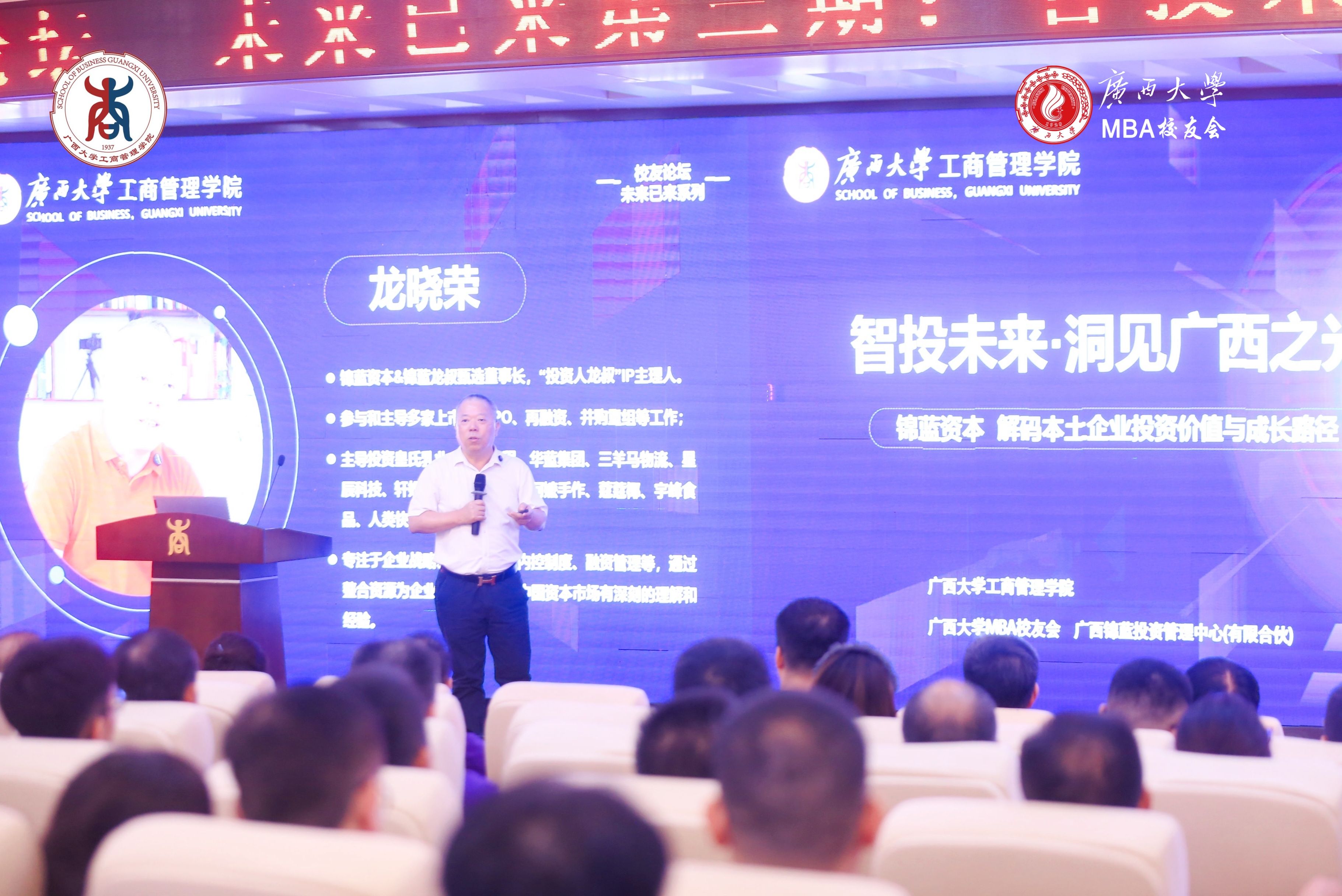 MBA校友会联合主办的“未来已来”校友论坛第三期——“智投未来・洞见广西之光”,特邀锦蓝资本创始人、“投资人龙叔”IP主理人龙晓荣先生担任主讲嘉宾,与太阳城官网