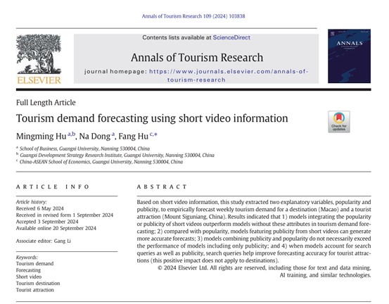 胡芳博士合作撰写的《Tourism Demand Forecasting Using Short Video Information》学术论文在旅游管理国际高水平期刊《Annals of Tourism Research》在线发表。《Annals of Tourism Research》是JCR分区Q1区期刊,中科院1区TOP期刊,ABS四星期刊,2023年影响因子为10.4。