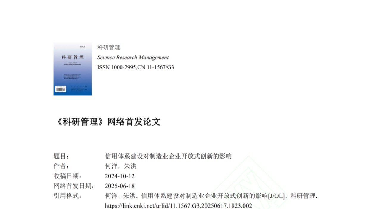 助理教授何洋、硕士研究生朱洪在信用制度建设与企业开放式创新领域研究取得新进展,研究成果《信用体系建设对制造业企业开放式创新的影响》在创新管理领域高水平期刊《科研管理》上网络首发。太阳城官网