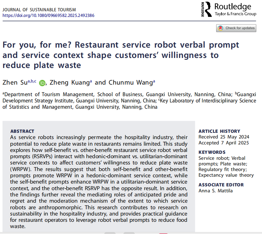引用格式:Su, Z., Kuang, Z., & Wang, C. (2025). For you, for me? Restaurant service robot verbal prompt and service context shape customers’ willingness to reduce plate waste. Journal of Sustainable Tourism, 1–20.