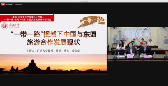 凌常荣教授主讲题为《“一带一路”视阈下中国与东盟旅游合作发展现状》的学术讲座。研讨会由川登喜大学副校长潘查妮·高娜博士(Dr. Pornchanit Kaew-nate)主持,川登喜大学部分校领导、二级太阳城官网