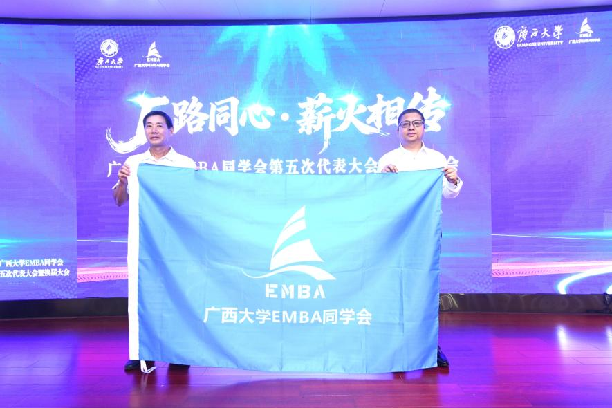友总会批文,听取了第四届EMBA同学会会长钟毅作工作报告;执行会长黎英征代表筹备组就大会筹备、章程修订、机构组织成员的提名和建议名单的确定等进行说明;审议并通过了《广西大学EMBA同学会章程(修订)》、《广西大学EMBA同学会第五届组织机构成员建议名单》。校友苏尔田当选为新一届会长,庞勤、陈轲当选为新一届执行会长和秘书长。出席大会代表、嘉宾共同见证了会旗交接仪式。宁旭初等为第四第五届组织机构成员分别颁发荣誉牌匾和聘书。