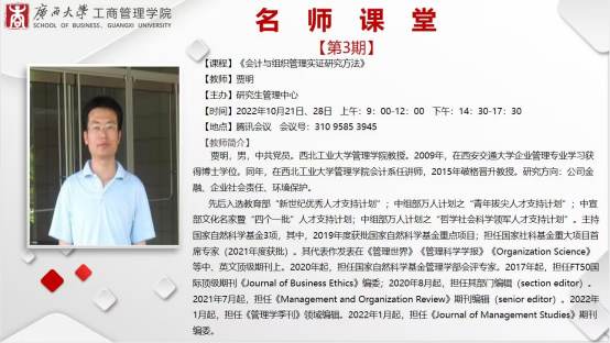 第一天的课程,贾教授结合自身科研成长历程和研究生培养经验,介绍了其如何在企业社会责任研究领域深耕,分析了其自身及团队成员获得大量高质量成果的原因,揭示了“信心+指导=成功”的科研成功之道,鼓励研究生同学们发表高质量论文。