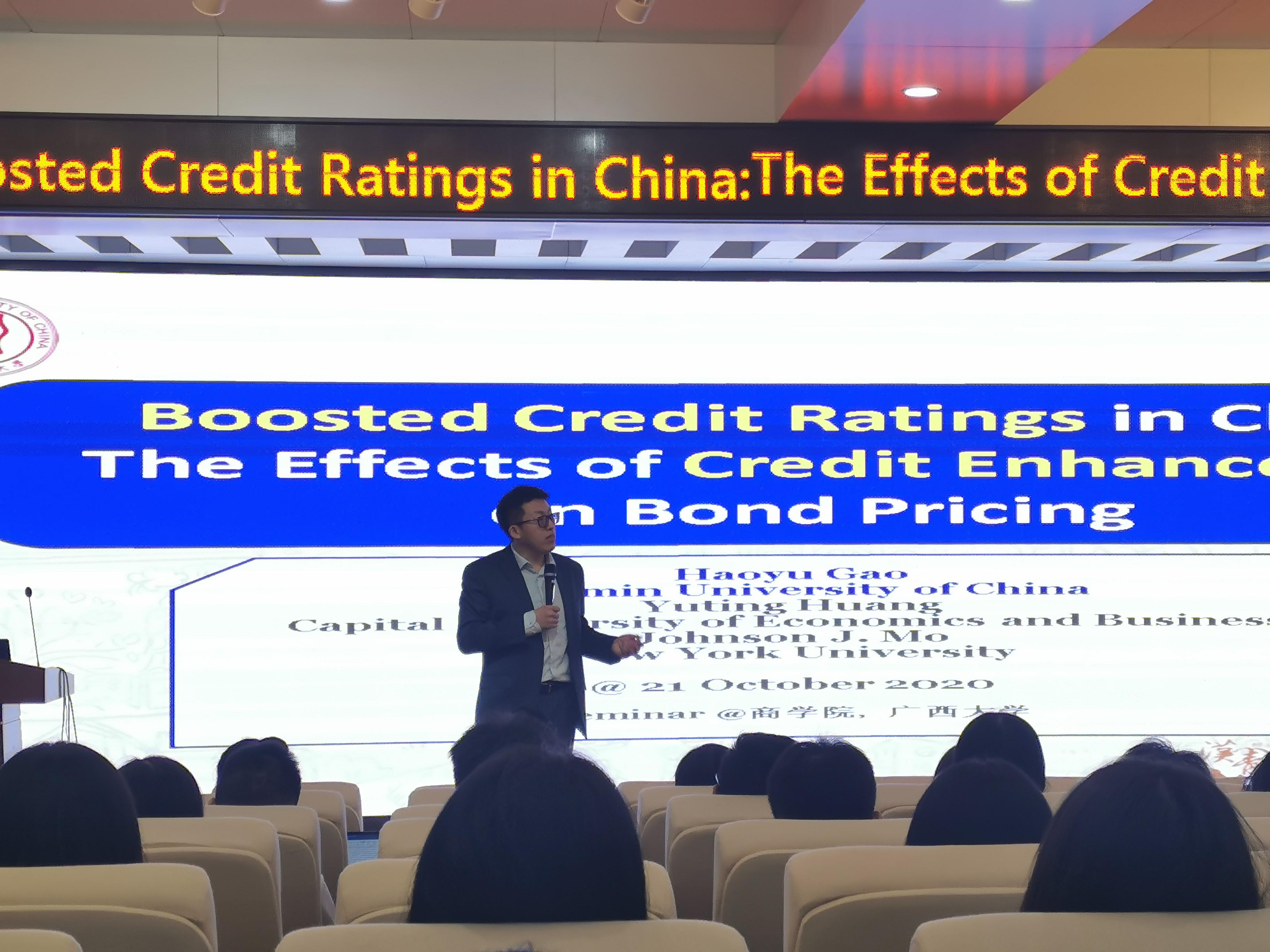 128报告厅进行了主题为“Boosted Credit Ratings in China: The Effects of Credit Enhancement on Bond Pricing”的学术报告。